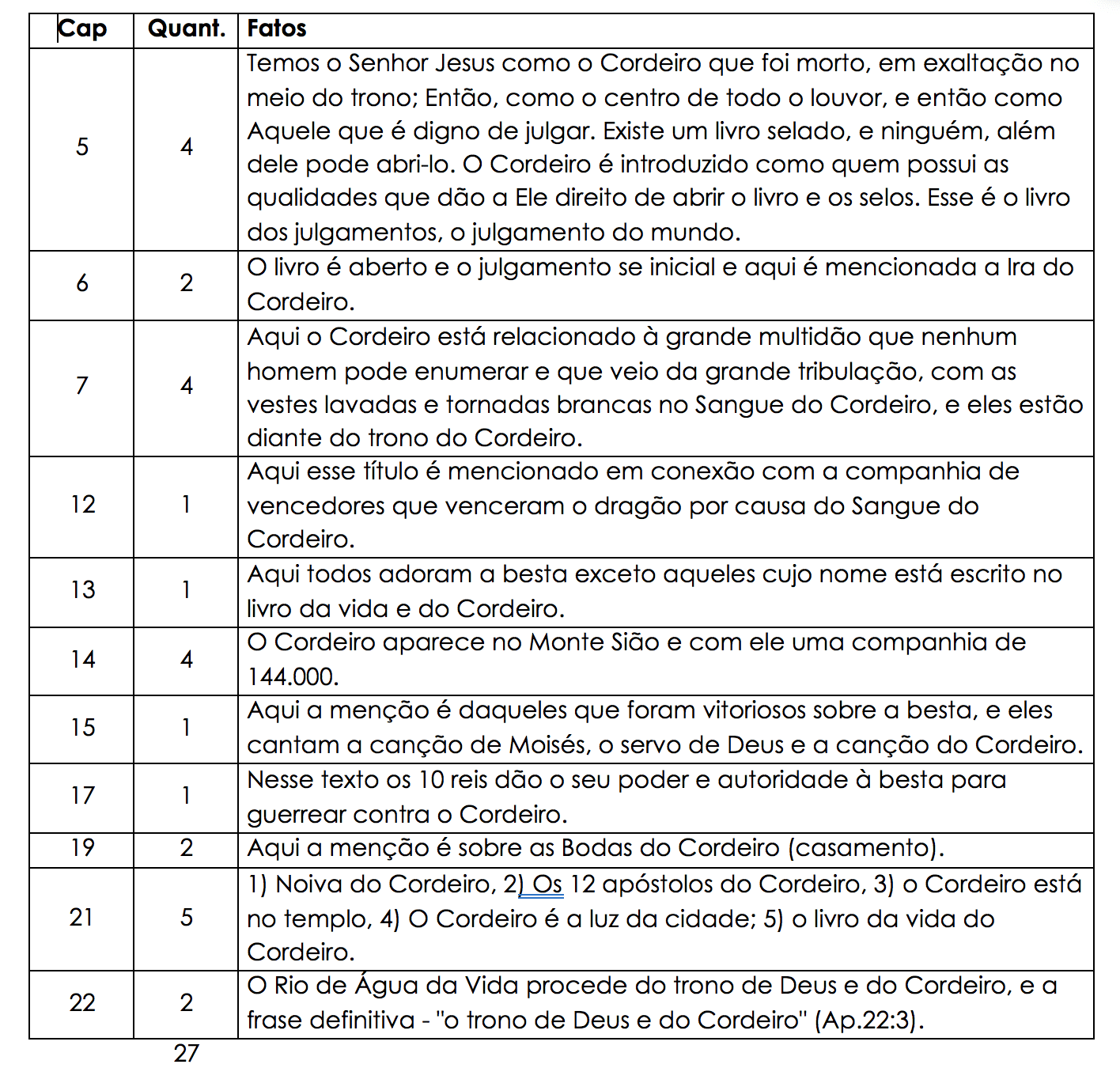 Abaixo vamos enumerar as diversas vezes que a palavra Cordeiro é mencionada no livro de Apocalipse. Isso vai nos ajudar muito em nosso estudo sobre o nosso Jesus, conforme retratado nesse livro!